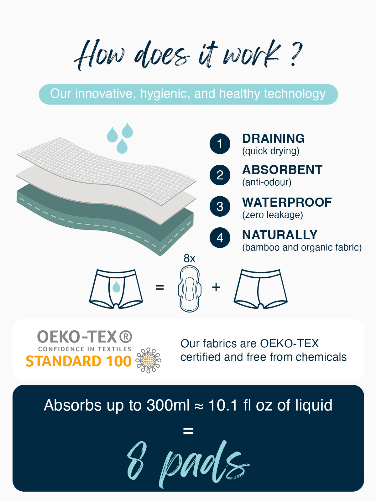 7 advanced layers for maximum absorption: Our boxer briefs feature a unique 7-layer construction, each with a precise function โ from moisture wicking to liquid retention โ ensuring up toย 10 fl oz of absorption, nearly 3x more than most products on the market.