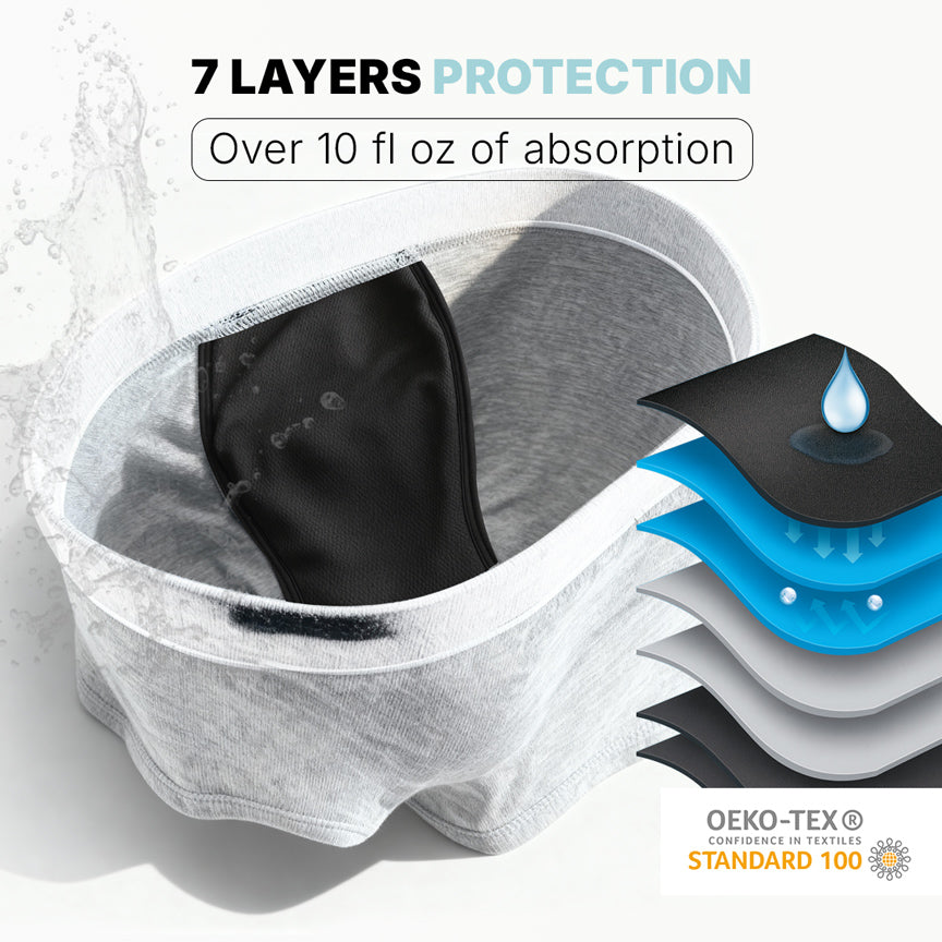 7 advanced layers for maximum absorption: Our boxer briefs feature a unique 7-layer construction, each with a precise function — from moisture wicking to liquid retention — ensuring up to 10 fl oz of absorption, nearly 3x more than most products on the market.